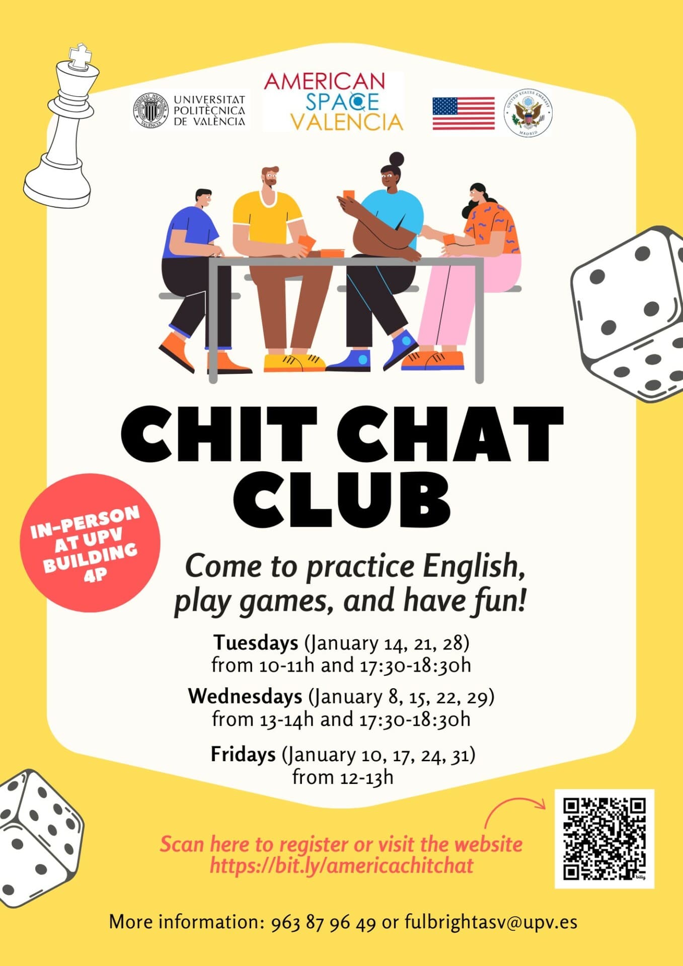 Looking for a fun way to improve your English? Join the American Space Valencia Chit Chat Club, a welcoming space to practice English conversation, play games, and connect with others. Whether you’re looking to build confidence, meet new friends, or just have a great time, this is the perfect place for you!